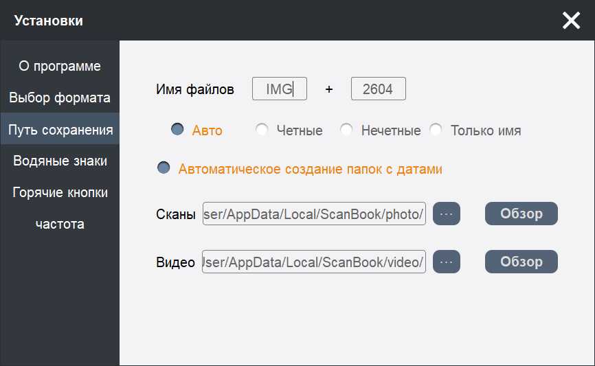 Пути сохранения (отдельно для сканов и видео) также задаются здесь, а еще устанавливается шаблон имени сохраняемых файлов.