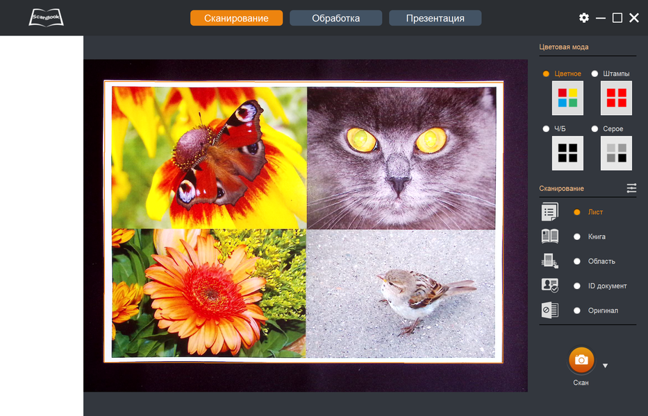 Для оригинала «Лист» происходит автообрезка по внешнему контуру — для этого и нужен черный коврик, цвет которого помогает определить границы документа, обозначаемые в программе рамкой оранжевого цвета. Для снимка происходит автоматический поворот изображения в нормальную позицию.