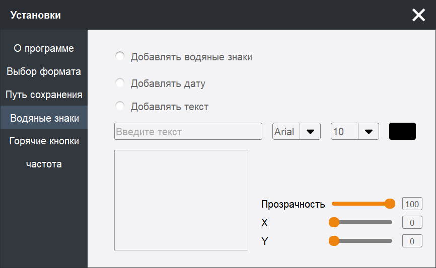 Предусмотрено добавление водяных знаков в виде даты или текста: