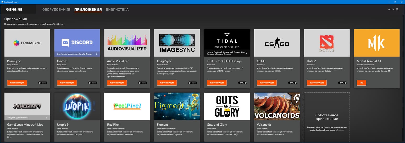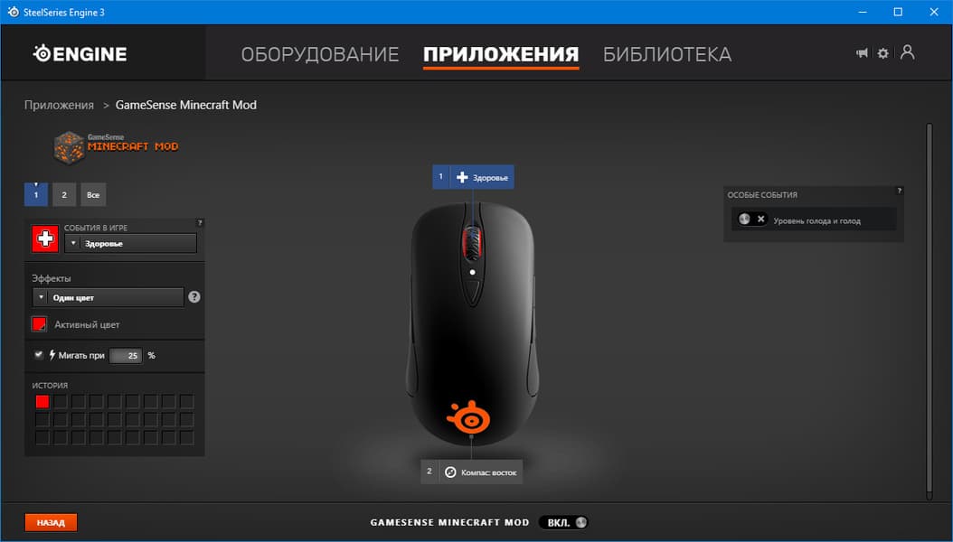 Приложения, присутствующие в списке, являются частью экосистемы SteelSeries Engine. Их задача заключается в отслеживании разных событий с дальнейшей RGB-визуализацией. Каждое приложение предназначено для обслуживания какого-то одного типа событий, универсальных программ здесь нет. Так, с помощью приложения Minecraft (ссылка на нужный для его работы мод присутствует в описании приложения), геймер может отслеживать, к примеру, уровень голода или здоровья, всего лишь взглянув на цвет одного из двух RGB-светодиодов мыши.