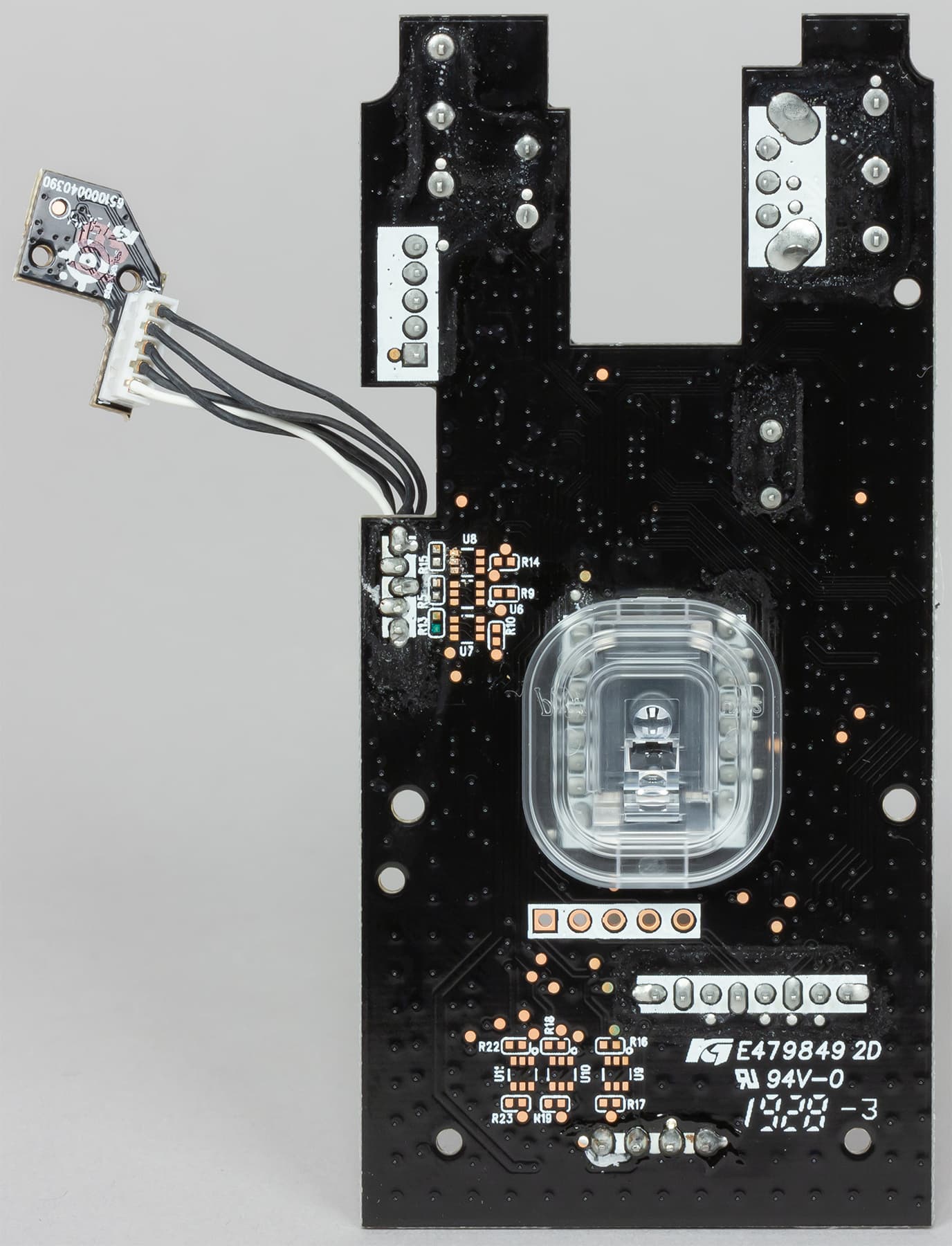 Электронные компоненты расположены на двух печатных платах. На фото можно видеть один из RGB-светодиодов, который образует зону подсветки логотипа.