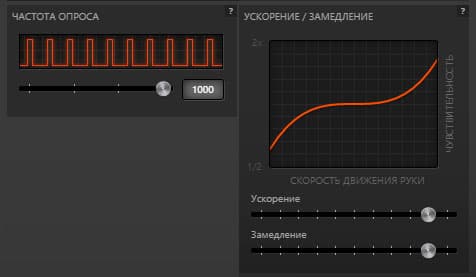 Другие функции более понятны: частота опроса, варьирующаяся в пределах от 125 до 1000 Гц, а также ускорение и замедление, настройка которых отображается в виде кривых.