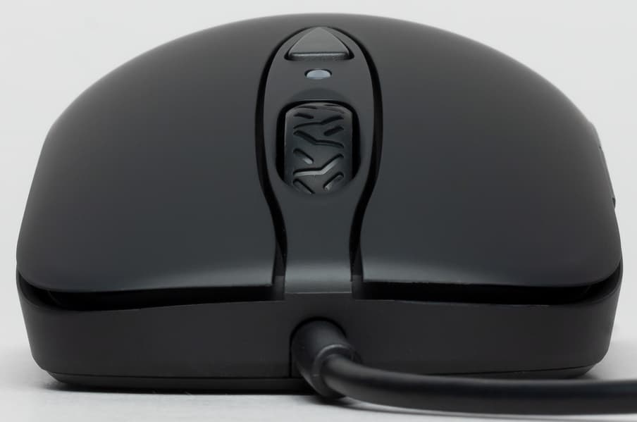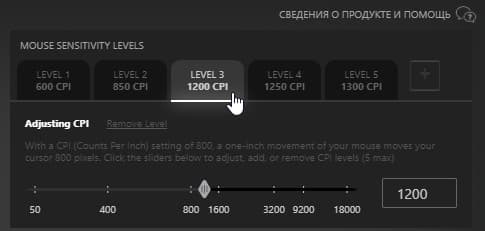Находящейся над колесиком кнопкой перебираются варианты чувствительности датчика, они задаются в настройках мышки. О переключении уровней чувствительности сигнализирует белый светодиод, врезанный между колесом и кнопкой: количество вспышек светодиода соответствует порядковому номеру выбранной предустановки чувствительности.