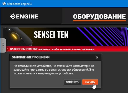 Настройка функций мыши производится в фирменном приложении SteelSeries Engine. При первом же запуске этой программы мы увидели оповещение о наличии важного обновления прошивки устройства.