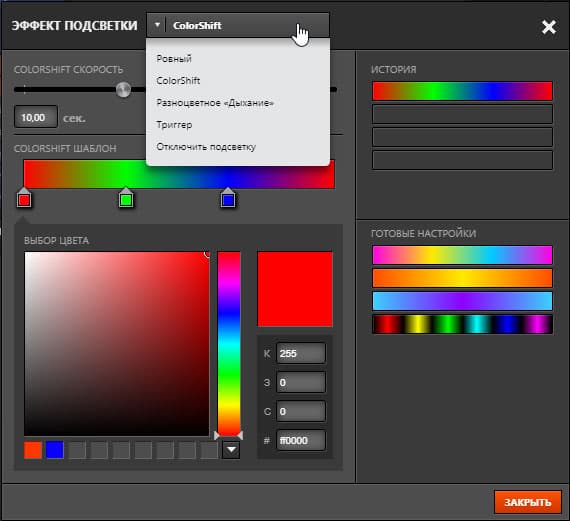 Настройка подсветки обоих RGB-светодиодов производится отдельно друг от друга. Здесь можно выбрать один из пяти вариантов поведения (ровное свечение, перебор цветов и т. д.), а для настройки цветовых схем используются шкалы с засечками, как в графических редакторах.