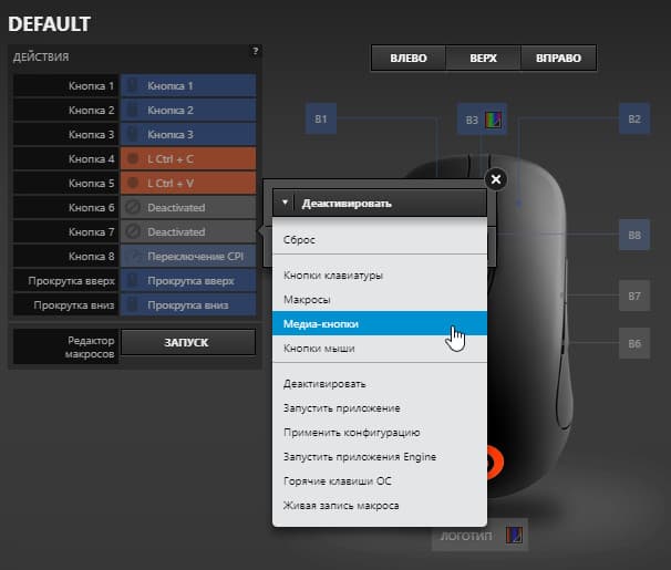 Назначение клавиш мышки изменяется в левом верхнем блоке. Процесс организован до предела наглядно: при выборе строки с кнопкой она подсвечивается на приведенной схеме, ошибиться невозможно. Нужная функция или клавиатурное сочетание выбирается из выпадающего меню, в котором присутствуют такие категории, как Кнопки клавиатуры, Макросы, Медиа-кнопки для управления воспроизведения музыки. Отсюда же можно запустить запись макроса, который будет присвоен выбранной кнопке. Разрешается также деактивировать выбранные клавиши, что мы тут же проделали с парой клавиш, расположенными на правом боку мышки (с непривычки эти кнопки постоянно нажимались при хвате безымянным пальцем правой руки).