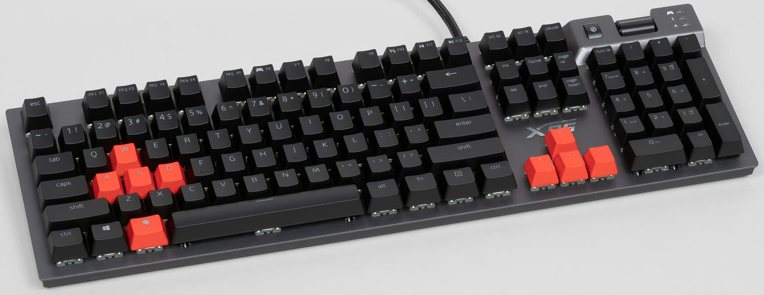 Summoner — это полноразмерная клавиатура с цифровым блоком, плюс есть еще отдельная кнопка выключающая звук и ролик громкости. Подсвечиваются все символы. Наш экземпляр тестовый, на нем нет кириллических символов, но это не говорит о том, будет ли кириллица на тех клавиатурах, которые поступят в продажу. Вдобавок в комплекте есть красные кейкапы для модников, которые хотят выделить наиболее часто используемые в играх клавиши, такие как курсорные и WASD.