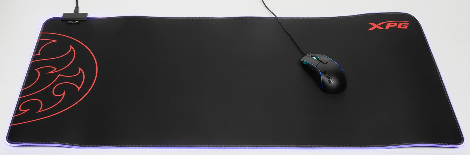 И клавиатура, и мышь отлично помещаются на коврике XPG Battleground XL Prime размером 90 на 42 сантиметра и 4 мм толщиной. Если включить подсветку, а такая возможность тут есть, получится эдакий половичок в стиле киберпанк.