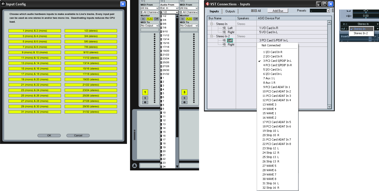 Роутинг сигнала сделан удобно, со стрипа звуковой/midi поток можно отправить на другой стрип (основной или aux) или на любой физический выход карты/контроллера или внешнюю программу по re-wire. Несколько огорчает топорная реализация роутинга каналов, что для большинства будет не критично. В CuBase при выборе задействованных каналов можно отдельно составить нужные сочетания каналов и дать собственные названия. При выборе каналов показываются и аппаратные названия. На скриншоте показано, как не просто с ходу выбрать нужный канал в Ableton от E-MU1212m.