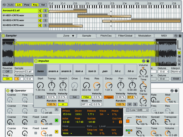 Инструментов три: Sampler, Impulse и Operator.
