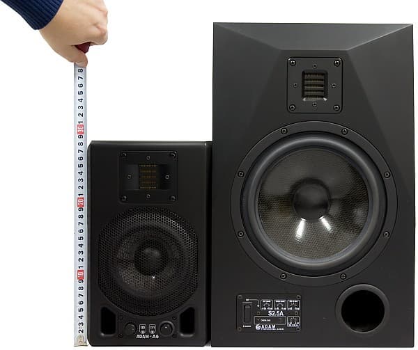 Производитель указывает размер вуфера 14,7 см, в дюймах — 5,5″. Измеренный диаметр внешних границ повеса диффузора составил 11 см. Таким образом эффективный диаметр в дюймах составляет около 4,3″. Для сравнения, в ADAM A7 динамик по подвесу — 13,5 см или 5,3″, при заявленных 6,5″. Никакого обмана здесь нет. Традиционно размеры динамиков в дюймах копируются из спецификаций производителей самих динамических головок, которые указывают их по габаритным размерам. Надо просто иметь в виду, что часть динамика, формирующая звук, обычно заканчивается дюймом ранее.