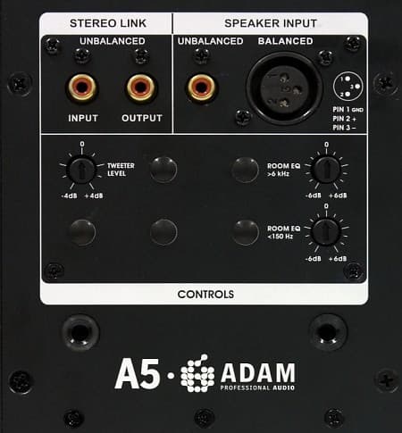 Как и в случае с A7, в мониторах A5 имеются балансный XLR и небалансный RCA вход. Нововведением является присуствие технологии StereoLink. Зачем это нужно? В профессиональной сфере раздельная подача сигнала каждого канала на свой монитор является нормой. В то же время бытовой аппаратуре подключение зачастую осуществляется межблочным стереокабелем. Технология StereoLink как раз и позволяет подключить межблочник со стерео RCA в один монитор, при этом соединив мониторы идущим в комплект кабелем. Таким образом достигается не только удобство коммутации, но и возможность регулировки громкости единым регулятором только с одного монитора.