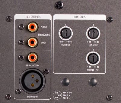 Задняя панель мониторов представляет собой металлическую пластину. Радиатор находится внутри корпуса. Здесь располагаются регуляторы, осуществляющие управление фильтрами, и отдельно уровня громкости твитера.