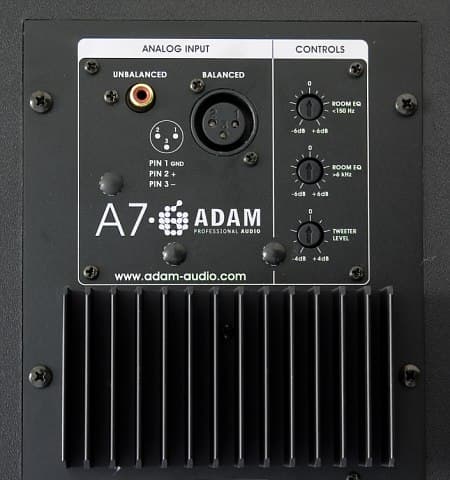 Задняя панель мониторов представляет собой металлическую пластину с выведенными наружу ребрами радиатора. Здесь располагаются регуляторы, осуществляющие управление фильтрами и отдельно уровня громкости твитера, а также разъемы для подключения: балансный вход XLR и небалансный вход RCA.