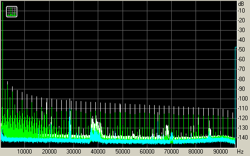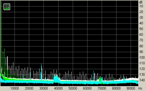 На меньшей нагрузке в 4 Ом наблюдаются гармоники высших порядков с уровнем -100~110 дБ. При этом с ростом порядка уровень практически не снижается (незначительный спад виден из-за спада АЧХ усилителя в области высоких частот).