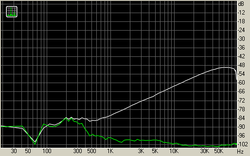 На высоких частотах видно увеличение взаимопроникновения каналов. Уровень вполне приемлемый, единственное, при подключении не напрямую к звуковому интерфейсу а через недорогой пульт, итоговое взаимопроникновение каналов может стать уже заметным на слух. Например, у пульта Behringer UB502 взаимопроникновение каналов примерно на 15 дБ выше, при аналогичном характере графика.