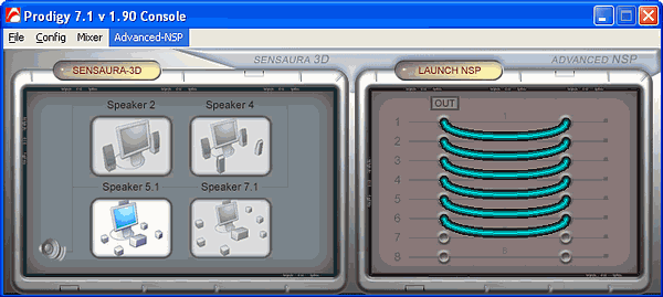 Поговорим об игровых возможностях карты. В отличие от традиционной схемы, сложившейся ещё со времён Terratec 6fire, когда Sensaura акутивируется в панели управления картой, у Prodigy 7.1 включение алгоритмов Sensaura реализовано по-другому. В панели управления данной опции вообще не имеется. А для того, чтобы задействовать Sensaura в играх в панели активного звуковго устройства Windows нужно выбрать виртуальное устройство Sensaura 3D. При этом, для проигрывания музыки и в профессиональных приложениях следует использовать Prodigy 7.1.
