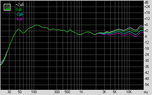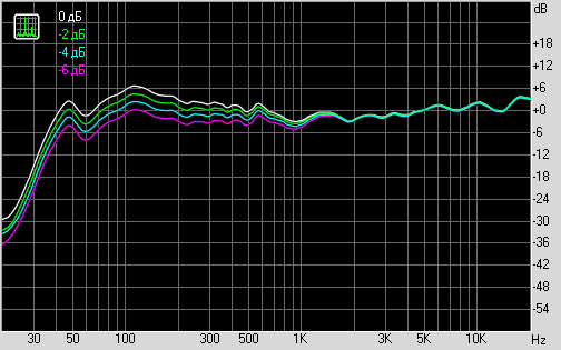 Как видно по графикам измерений, настройка влияет преимущественно на работу фазоинвертора. В целом АЧХ на 45 Гц подтверждает указанные 2 дБ при каждом следующем режиме.
