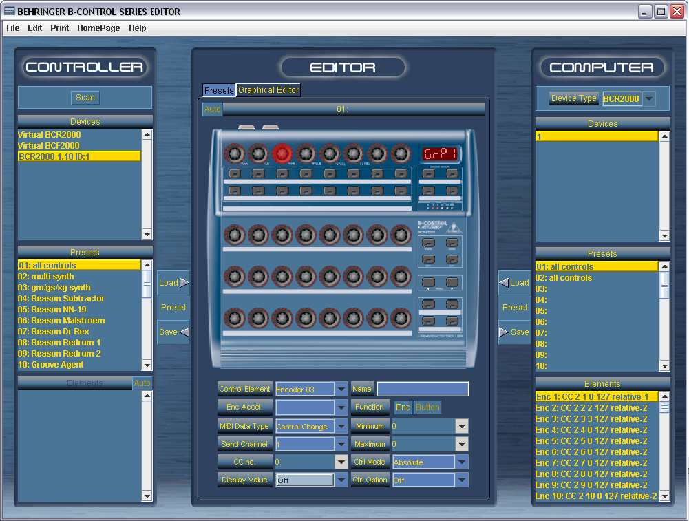 Behringer предлагает контроллеры серии B-Control для студии с высокой функциональностью и умеренной ценой, — это BCR2000, BCF2000/WF и NANO BCN44. Все эти устройства объединяет использование безупорных поворотных регуляторов (энкодеров).