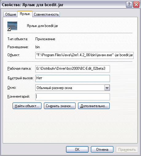 Далее - пример заполнения свойств ярлыка у автора (Win XP с установленной Java расположена на диске «F», а B-CONTROL EDIT на диске D, сам файл программы B-CONTROL EDIT называется bcedit.jar)