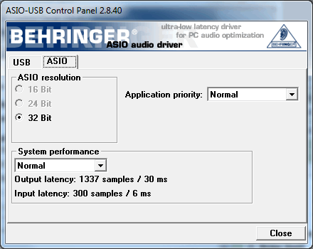 Настройки ASIO расположены на одноименной вкладке. Из имеющихся настроек доступна смена значений Latency и приоритета приложений. В самом быстром режиме Highspeed задержка для выхода и входа составляет 6 и 2 милисекунды соответственно.