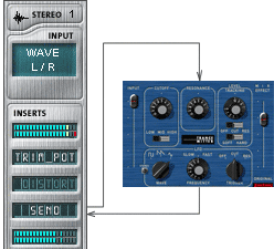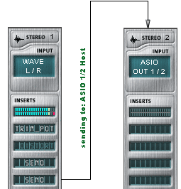 Для того, что бы сделать запись в WDM или входной канал в ASIO нужно использовать команду роутинга сигнала Send. Для WDM используется команда WAVE Host Wave R/L, а для ASIO выбирается Send на свободные в микшере ASIO каналы, которые в микшер стрипами не загружаются.