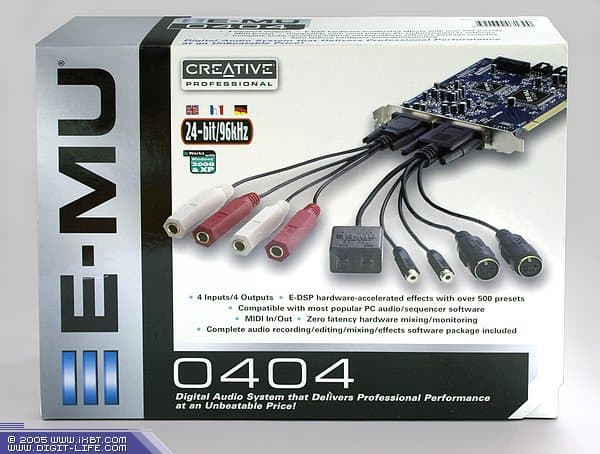 Модель E-MU 0404 является самой простой и дешевой звуковой картой из профессиональной линейки Digital Audio Systems*. У обозреваемой сегодня карты отсутствует FireWire-порт, а конверторы (АЦП, ЦАП) расположены на основной плате. Разъемы коммутации вынесены наружу с помощью переходников c многоконтактных разъемов на брекете. Рекомендуемая розничная стоимость карты на сайте производителя составляет всего $99.