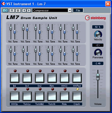 Не менее интересный инструмент, но уже не синтезатор, а 24-битный drum-модуль. Включает в себя три сета по двенадцать семплов в каждом. Очень чистенькие семплы классического (живого) барабана и перкуссии. Электронный сет по качеству несколько недотягивает до остальных. Доступные регулировки LM7 видно на скриншоте. Это, так сказать, младший брат не входящего в комплект более крутого и навороченного drum-модуля LM4.