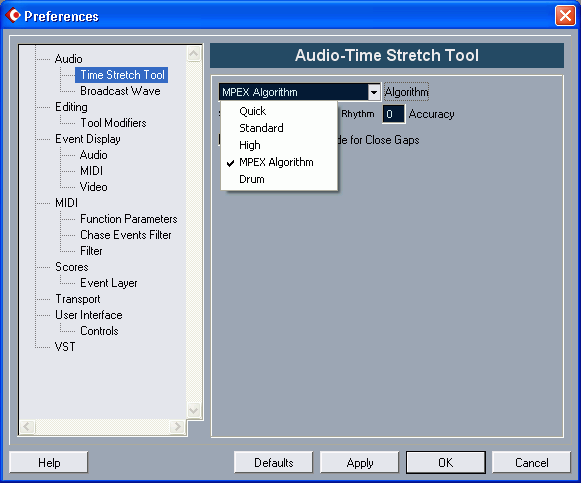При большом количестве дорожек на воспроизведение в формате 24/96 мощности компьютера может не хватить. К счастью, в Cubase SX работать можно и в 16/44, делая финальное сведение и мастеринг в 24/96 не в реальном времени. Все отличные от текущего форматы будут пересчитываться к формату проекта. В начале обзора, в сравнительной таблице в графе «алгоритмы pitch-shift/time stretch» у версии SX был указан дополнительный режим MPEX. Это аббревиатура фирменной технологии от Рrosoniq.