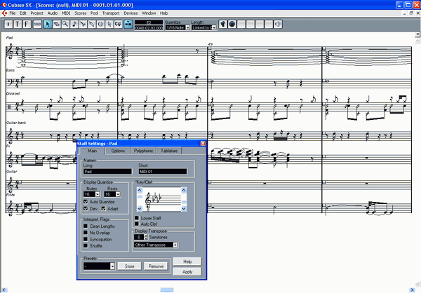 В Cubase SX очень здорово реализовано редактирование нот, а если быть точнее, нот в партитурном виде. Вашему вниманию предоставляется очень много вариантов нотного письма. От классического до партитуры для эстрадного ансамбля. При этом можно тут же распечатать эти страницы.