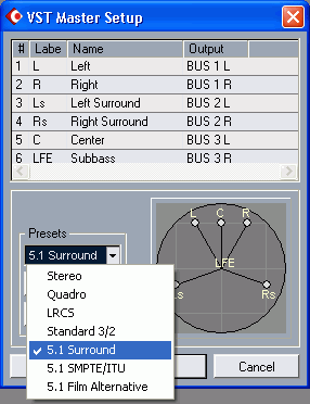 - 5.1 SMPTE/ITU и 5.1 Film Alternative — та же схема 5.1, но с альтернативным назначением каналов.