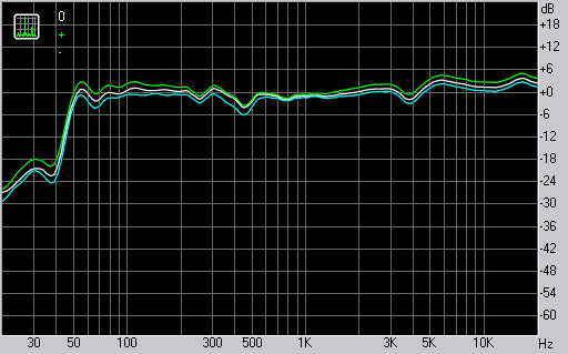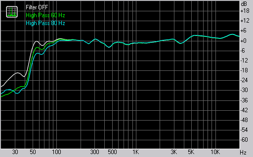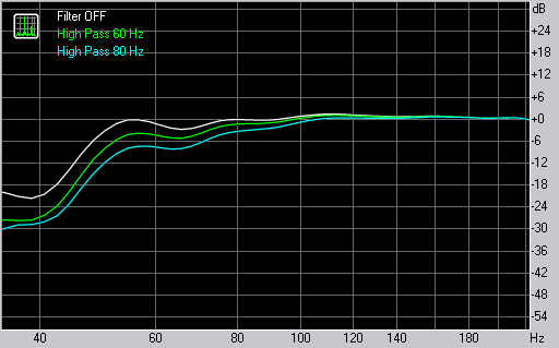 Обрезные фильтры ФВЧ позволяют не только улучшить сопряжение мониторов с активным сабвуфером, но и управляют отдачей на НЧ в целом. В зависимости от положения мониторов относительно стен и стола или микшерной консоли, можно снизить уровень НЧ, если он избыточен. Для 5-6" мониторов с ФИ всегда лучше внимательно следить за НЧ, чтобы при необходимости снизить эффективность резонансной схемы и увеличить разборчивость, пожертвовав рекордными паспортными характеристиками. Наши измерения проводились в 20 см от стены на массивной стальной стойке на шипах с резиновым вибропоглотителем. Как видим, в этом случае в нулевом попложении есть небольшой подъем на 55 Гц — паспортная частота настройки порта ФИ.