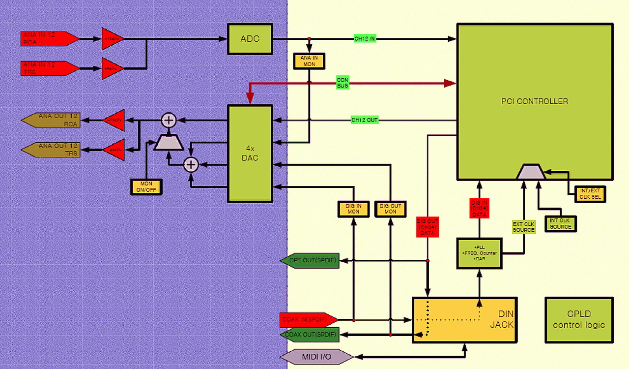 Из структурной схемы карты ESI Juli@ видно, что 8-канальный ЦАП AKM 4358 (обозначен как 4х DAC) используется в стереокарте не случайно — он служит для аппаратного мониторинга цифровых входов/выходов с абсолютно нулевой задержкой.