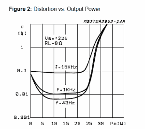 Из приведенных графиков следует, что при данном напряжении питания TDA2052 развивает мощность до 22 Вт при менее 0,1% искажений. Двухканальная TDA7294 рассчитана на усиление сигнала НЧ-головки и при приведенном напряжении питания развивает мощность до 55 Вт при менее 0,1% искажений. Однако при реальном (меньшем) напряжении значения мощности будут ощутимо ниже.