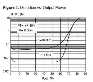 В усилительном тракте используется Ш-образный трансформатор, обеспечивающий биполярное питание 13,5 В на 1,2 А и 20 В на 1,6 А. В качестве усилительных микросхем производитель использует микросхемы TDA7294 и TDA2052 компании ST Microelectronics. Давайте взглянем на графики зависимости искажений от мощности, взятые из спецификации на микросхемы (для напряжения питания 35 В и 22 В):