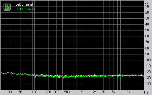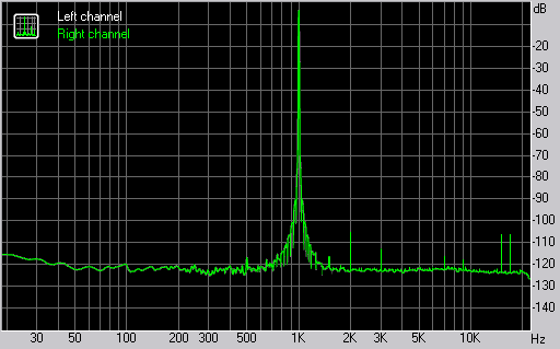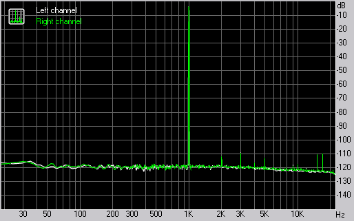 Измерения интерфейса в loopback дают 93-94 дБА в режиме 24 бит 44 кГц. При этом спектр шума чист, а искажения практически не видны. Измерения только выхода практически не дают улучшений — шум остается на уровне 94-96 дБА. Пределы цифр даны при измерении в двух различных компьютерах при питании от шины FireWire.