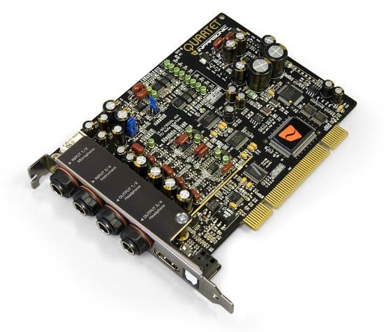 У внутренних карт PCI прослеживается определенная зависимость спектра собственного шума от наводок по цепям питания, проблем с землей и других факторов. Производитель карты Quartet говорит о применении собственной технологии "US-PSB class I" (Ultra Stable Power Supply Block) для фильтрации поступающего питания. Её суть в применении специальной схемы на дискретных элементах, вместо обычно применяемых интегрированных стабилизаторах питания. В дополнении к этому, введена схема плавной подачи питания, "Slow slope ON", для защиты мониторов и наушников от щелчка при включении ПК.