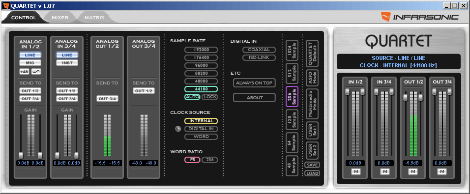 Infrasonic Quartet — одно из таких решений, претендующих на полноценную замену внешнему многоканальному интерфейсу с микрофонными и прочими входами/выходами. Благодаря своей функциональности Quartet также составляет конкуренцию традиционной звуковой карте с подключенным внешним микшером.