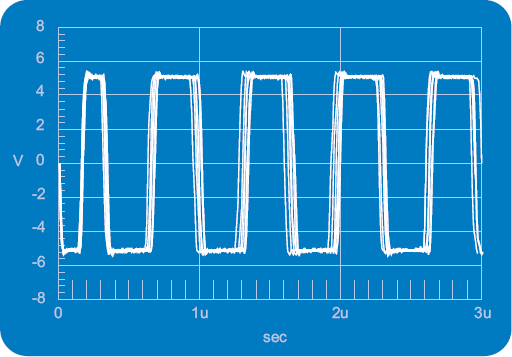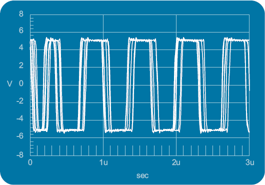 Простейший и наиболее неудачный пример такого пути — это «наблюдение формы сигнала на осциллографе», подключив сигнал с джиттером к осциллографу, как показано на графике 2. К сожалению, вы получите вводящий в заблуждени результат, который будет зависеть от несовершенства генератора осциллографа, а также от спектра джиттера сигнала. Вместо джиттера, такой способ показывает интервальное отклонение. Между ними есть определенная связь, но на некоторых частотах джиттер не будет виден вовсе, тогда как на других амплитуда джиттера может удвоиться. В частности, если речь идет о низкочастотном джиттере.