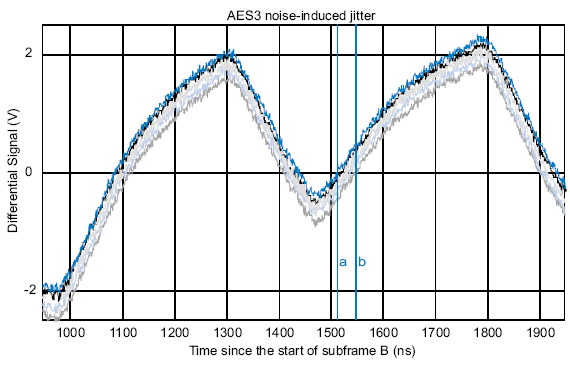 Сказанное проиллюстрировано на графике 10, где показано пять идентичных фрагментов Y-заголовка субфрейма B. (Как говорились выше, это неизменяемая комбинация данных нечувствительно к джиттеру данных, что позволяет изучить вызванный шумом джиттер более точно.) Две отметки, «a» и «b», показывают временной диапазон пересечения нуля третьим по счету импульсом. Интервал равен 31 нс. В этом примере производимое шумом отклонение является низкочастотным синусоидальным сигналом с амплитудой около 300 мВ. Такая помеха может быть вызвана линиями питания сети переменного тока.