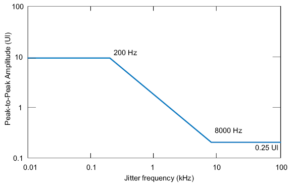По мере приближения частоты джиттера к частоте среза, допуск существенно уменьшается. Это происходит потому, что резонансы в ресивере приводят к тому, что согласование между отклонением времени синхронизации передачи входных данных и приблизительного подсчета времени синхронизации самим ресивером, получается хуже, чем, если бы ресивер совсем не реагировал на джиттер.