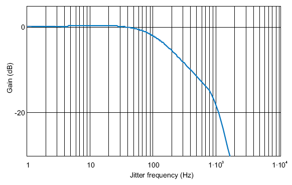 Обратите внимание, что ниже частоты среза коэффициент усиления достигает максимального значения, примерно равного 0.5 дБ. Подобное небольшое усиление вполне обычно для частот, чуть ниже частоты среза. Это явление носит название пиковый джиттер или всплеск джиттера (jitter peaking). Оно возникает из-за особенностей фазовой характеристики цепи обратной связи ФАПЧ.