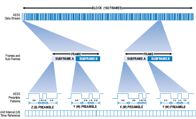 В каждом случае данным предшествует заголовок Y, начинающий субфрейм B (График 8). Этот заголовок фиксирован и продолжается 5 битовых периодов (то есть 10 интервальных единиц, 10 UI). В результате этого, независимо от последующих данных сигналы после заголовка имеют примерно тот же самый уровень, так как они перед этим прошли тот же самый путь. Заголовок номинально длится 8 UI, но так как конец предшествующего бита и начало последующего фиксированы схемой кодирования, в результате постоянная часть имеет продолжительность 10 UI.