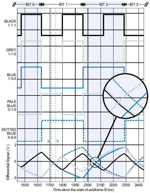 Черный, серый и синий графики имеют начало смены модуляции в момент времени 1465 нс (9 UI) от времени начала субфрейма, так как они имеют в начале своих данных «1». Голубой и синий пунктирный графики начинаются с «0», так что у них импульс еще не начался. Все пять графиков меняют направление в момент 1628 нс (10 UI), соответствующий концу первого бита (частота семплинга данных 48 кГц, так что 1 UI здесь равен 162,8 нс).
