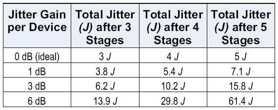 В цепи устройств с восстановлением клока с похожими характеристиками эффект повторяется на каждом этапе. Строчка со значением 6 дБ в таблице отражает уровень подъема джиттера оборудования, разработанного до того, как об этой проблеме стали серьёзно задумываться. Как показано в таблице, в таком случае суммарный джиттер достигает огромных значений, несмотря на небольшое число стадий.