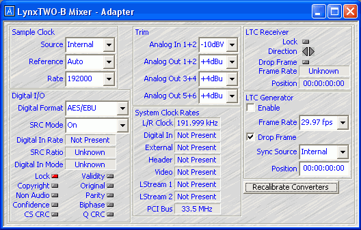 Из наиболее интересных особенностей можно отметить возможность независимого выбора опорного уровня сигнала для входов и выходов (+4 dBu / -10 dBV). Большое внимание уделено также цифровому интерфейсу — выведены все индикаторные флаги S/PDIF и AES/EBU DIF. Как известно, вопрос стабильности задающего генератора и синхронизации очень важен для профессионального оборудования. Поэтому Lynx Two имеет как индикацию частоты задающего генератора, так и возможность синхронизации по различным источникам, включая специальный блок синхронизации с видеосигналом.