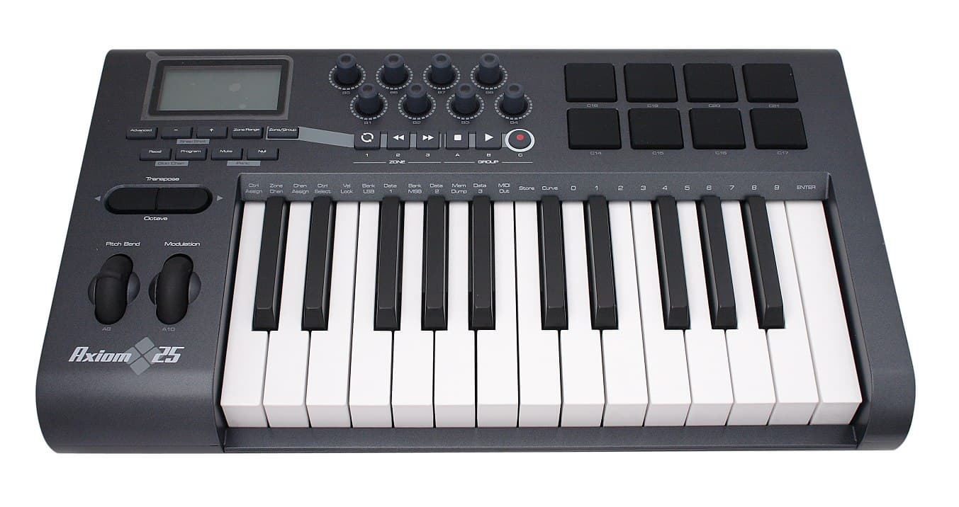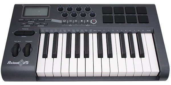 MIDI-клавиатура Axiom 25 оснащена полувзвешенной механикой с aftertouch. Помимо этого, имеются 8 покрытых резиной датчиков (pads) для забивки ударных и перкуссии, заимствованных у специализированного продукта M-Audio Trigger Finger.