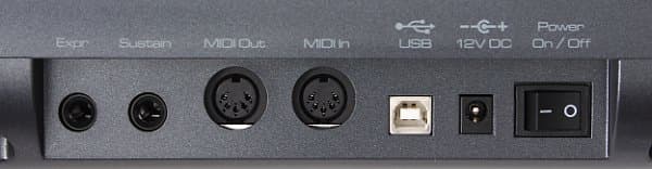 Панель коммутации расположена традиционно спереди и включает в себя: разъемы для подключения педалей; MIDI-выход и MIDI-вход; USB-порт; разъем для подключения внешнего блока питания и выключатель питания.