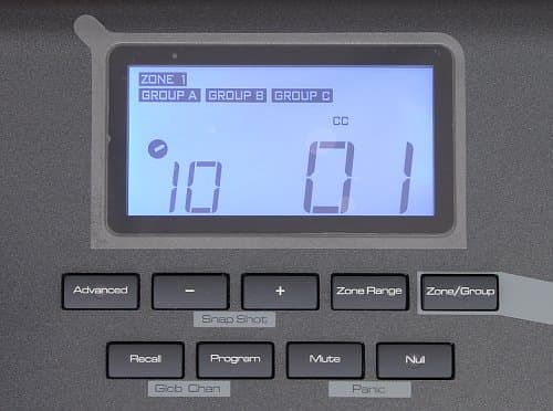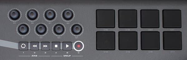 Справой стороны от экрана расположены восемь назначаемыx MIDI-регуляторов. Регулировка производится дискретно, без ограничителя. Под контроллерами находятся кнопки транспортной панели, которые также могут быть переназначены.