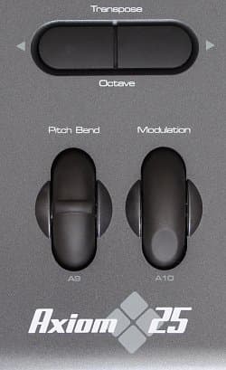 Интересной особенностью Axiom является также необычная конструкция колес pitch bend и modulation. Здесь они выполнены сравнительно больших габаритов. Первое время тактильные ощущения необычны, однако через какое-то время привыкаешь и перестаешь ощущать дискомфорт. По всей вероятности кнопки транспонирования/октавного сдвига имеют большие размеры из дизайнерских соображений.